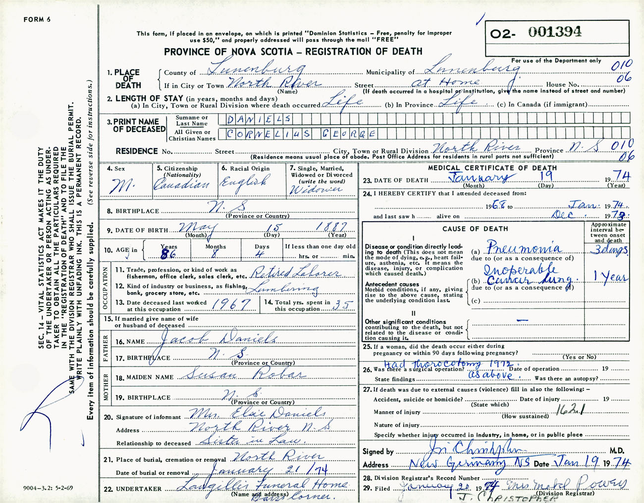 Male Death Registration: Year: 1974 number: 1394