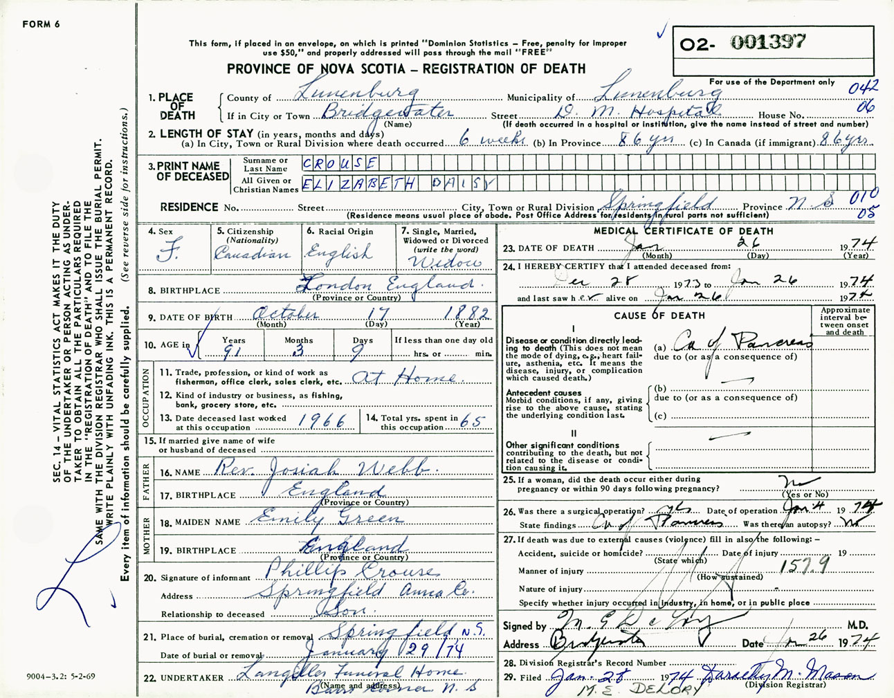 Female Death Registration: Year: 1974 number: 1397