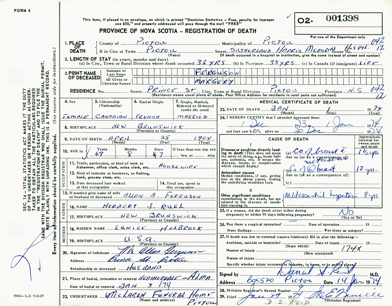 Female Death Registration: Year: 1974 number: 1398
