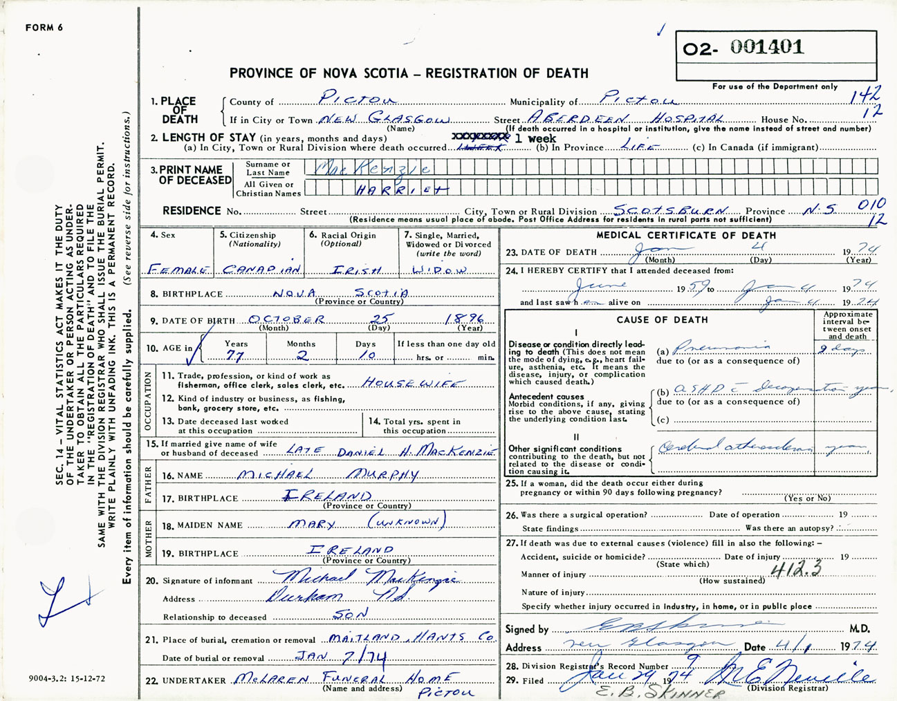 Female Death Registration: Year: 1974 number: 1401