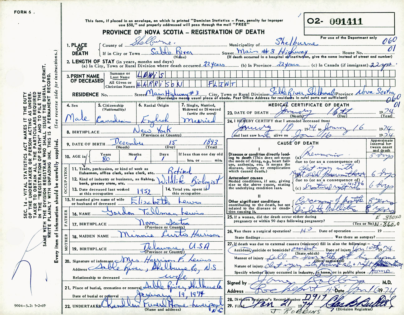 Male Death Registration: Year: 1974 number: 1411