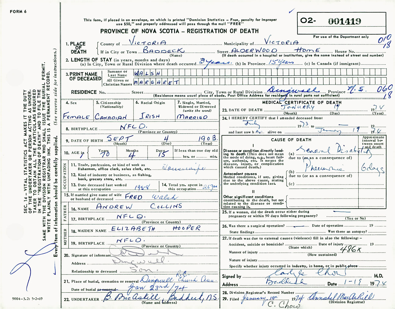 Female Death Registration: Year: 1974 number: 1419