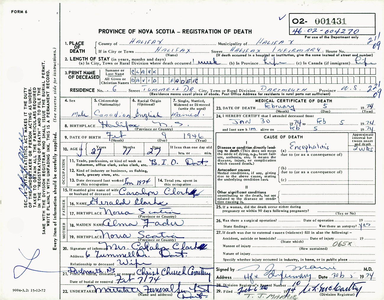Male Death Registration: Year: 1974 number: 1431
