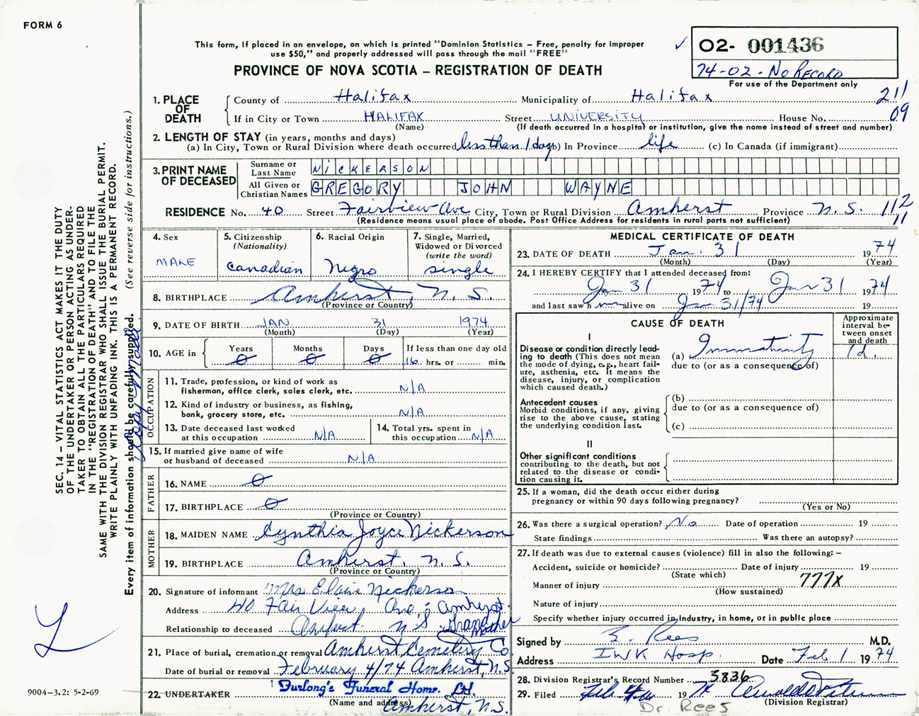 Male Death Registration: Year: 1974 number: 1436