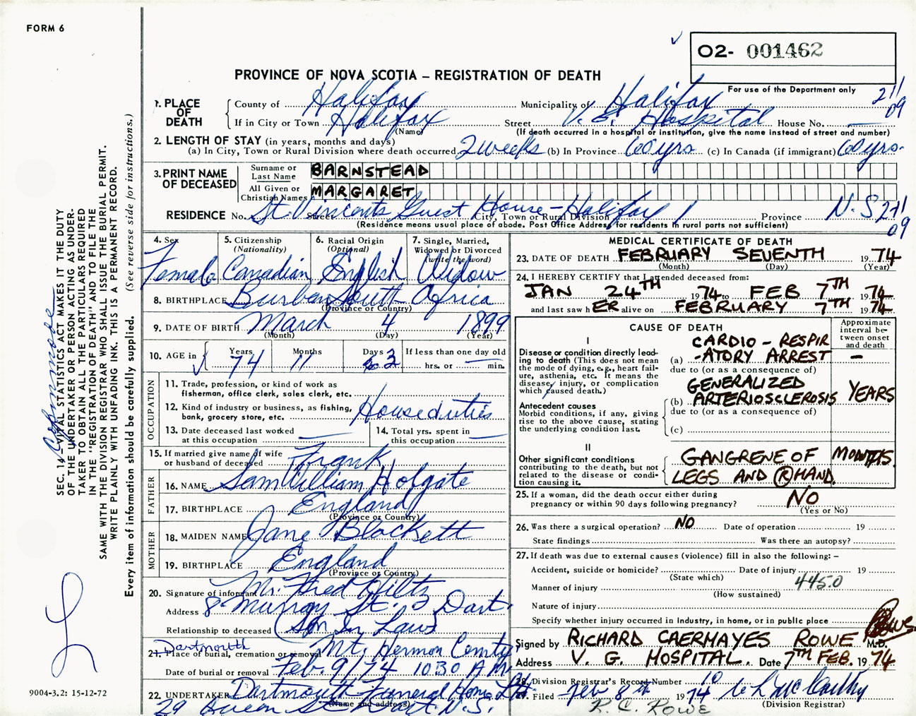 Female Death Registration: Year: 1974 number: 1462