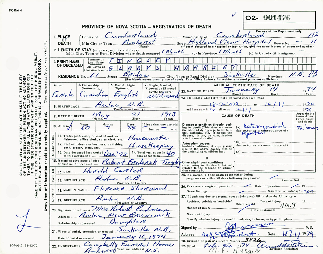 Female Death Registration: Year: 1974 number: 1476