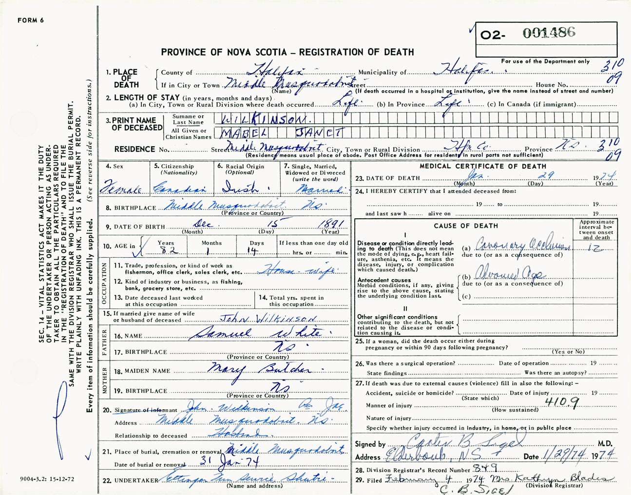 Female Death Registration: Year: 1974 number: 1486