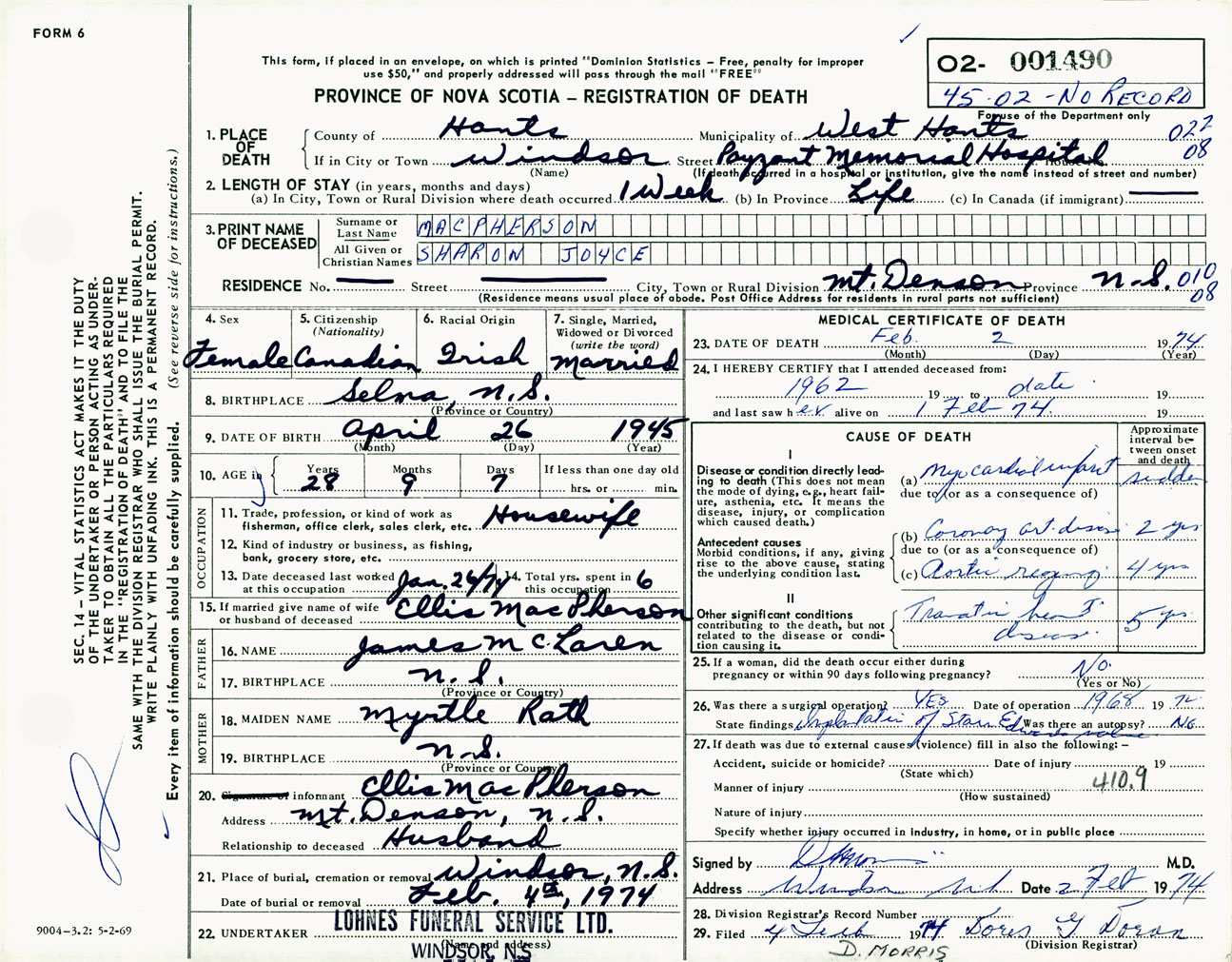 Female Death Registration: Year: 1974 number: 1490