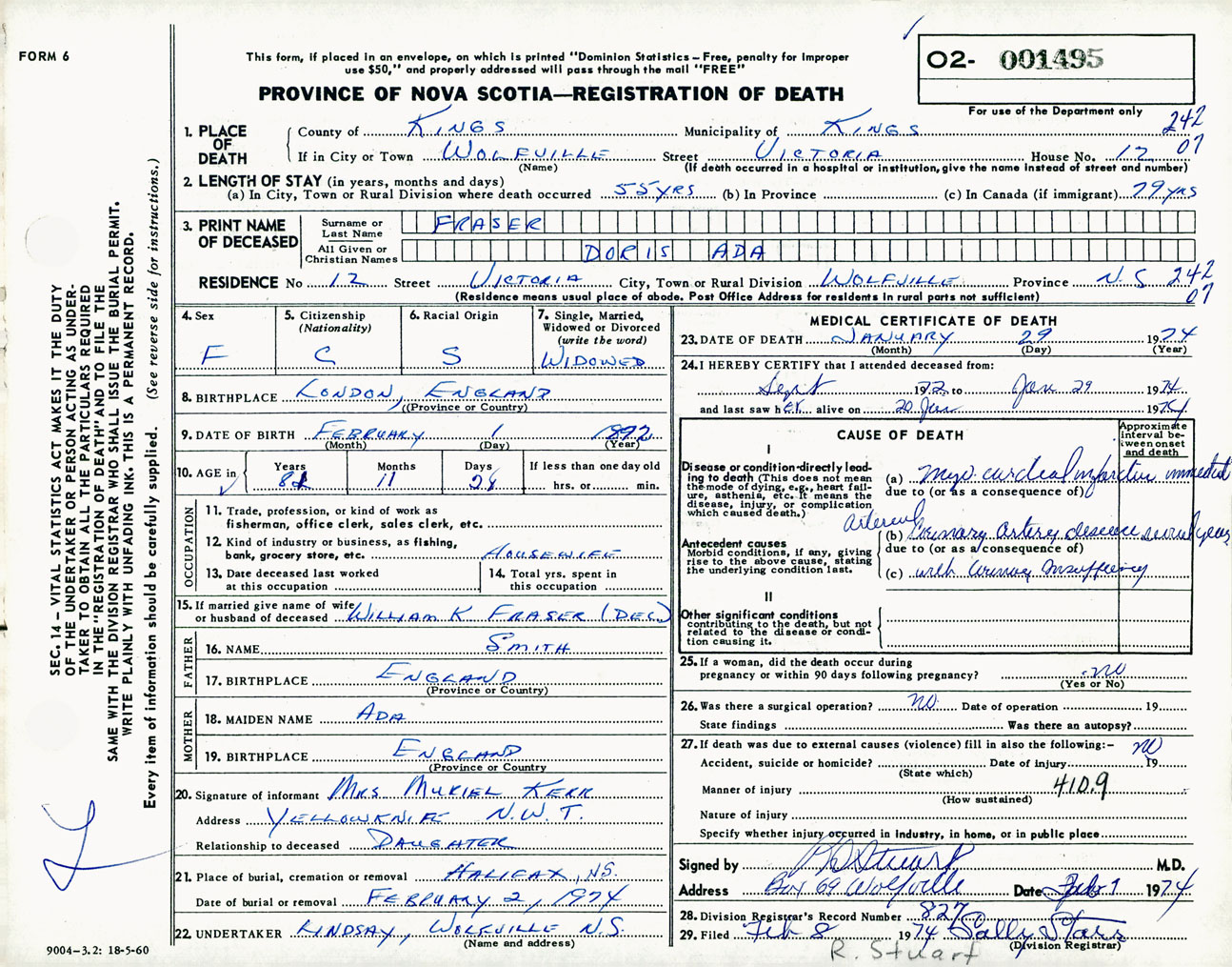 Female Death Registration: Year: 1974 number: 1495