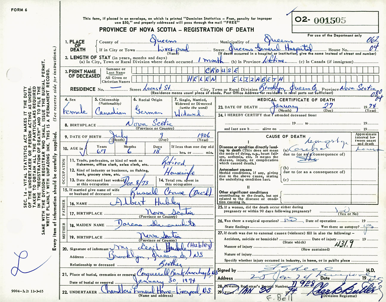 Female Death Registration: Year: 1974 number: 1505