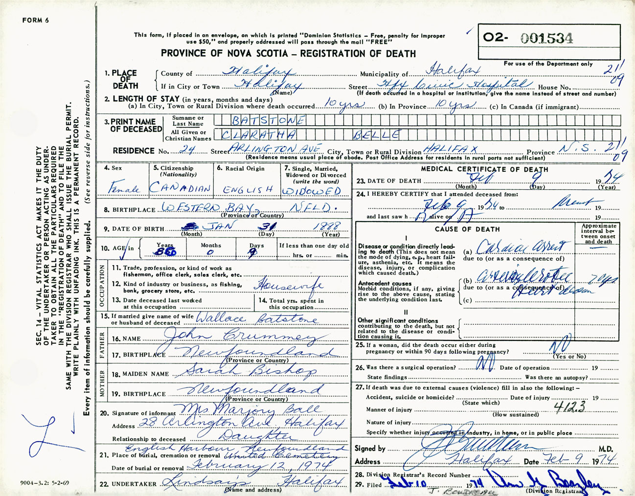 Female Death Registration: Year: 1974 number: 1534