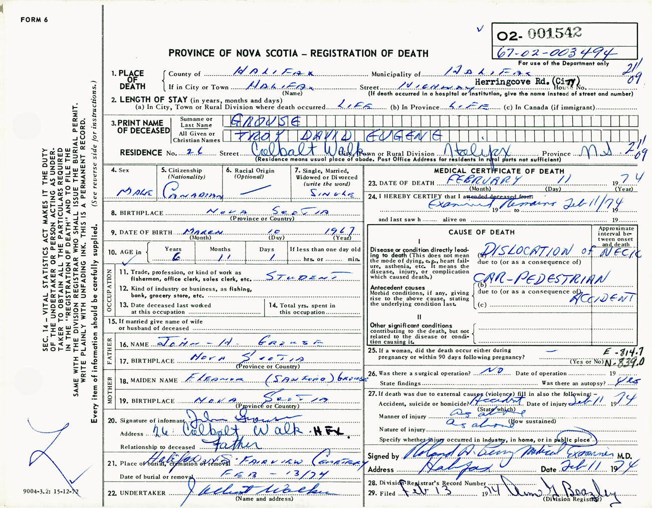 Male Death Registration: Year: 1974 number: 1542