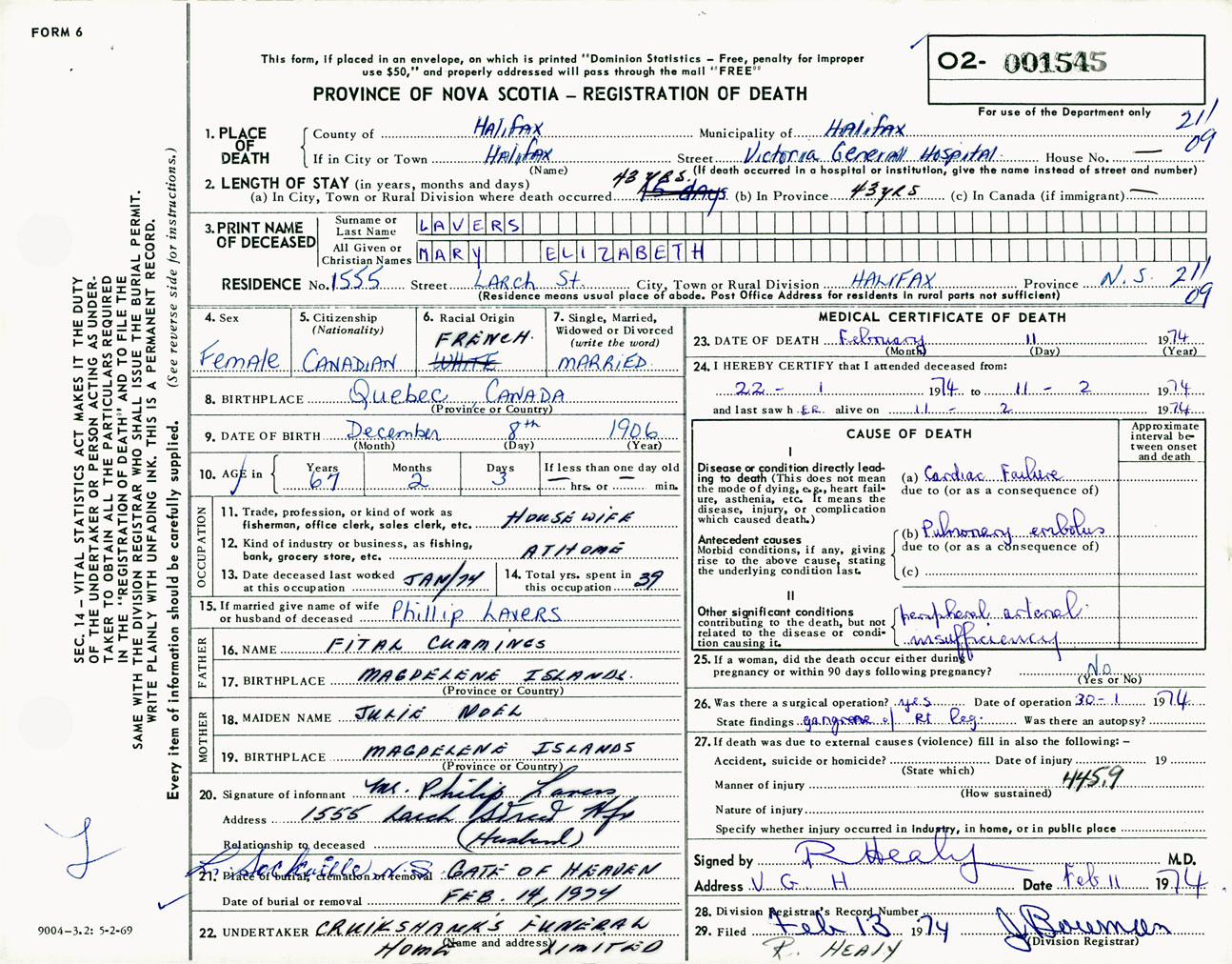 Female Death Registration: Year: 1974 number: 1545