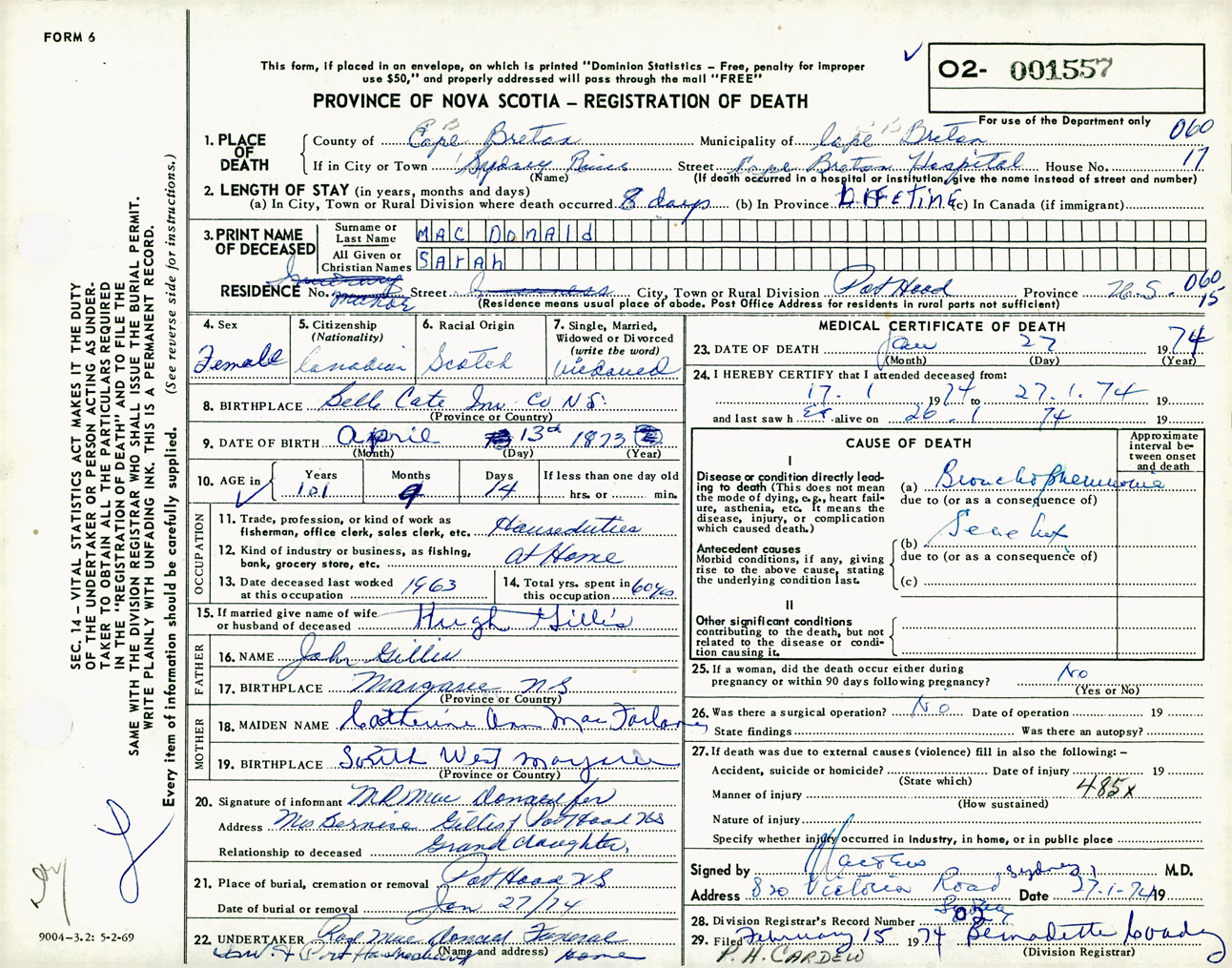 Female Death Registration: Year: 1974 number: 1557
