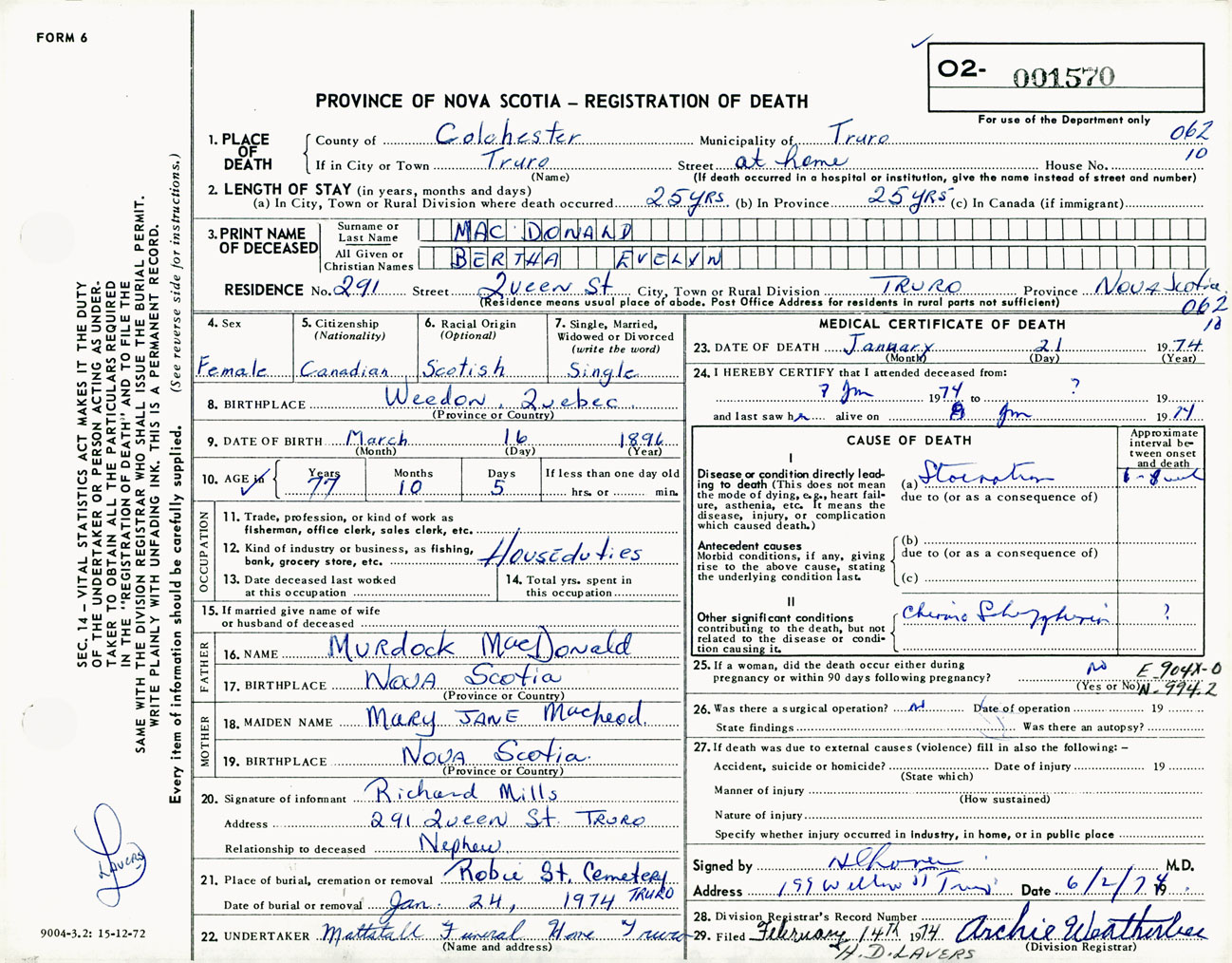 Female Death Registration: Year: 1974 number: 1570