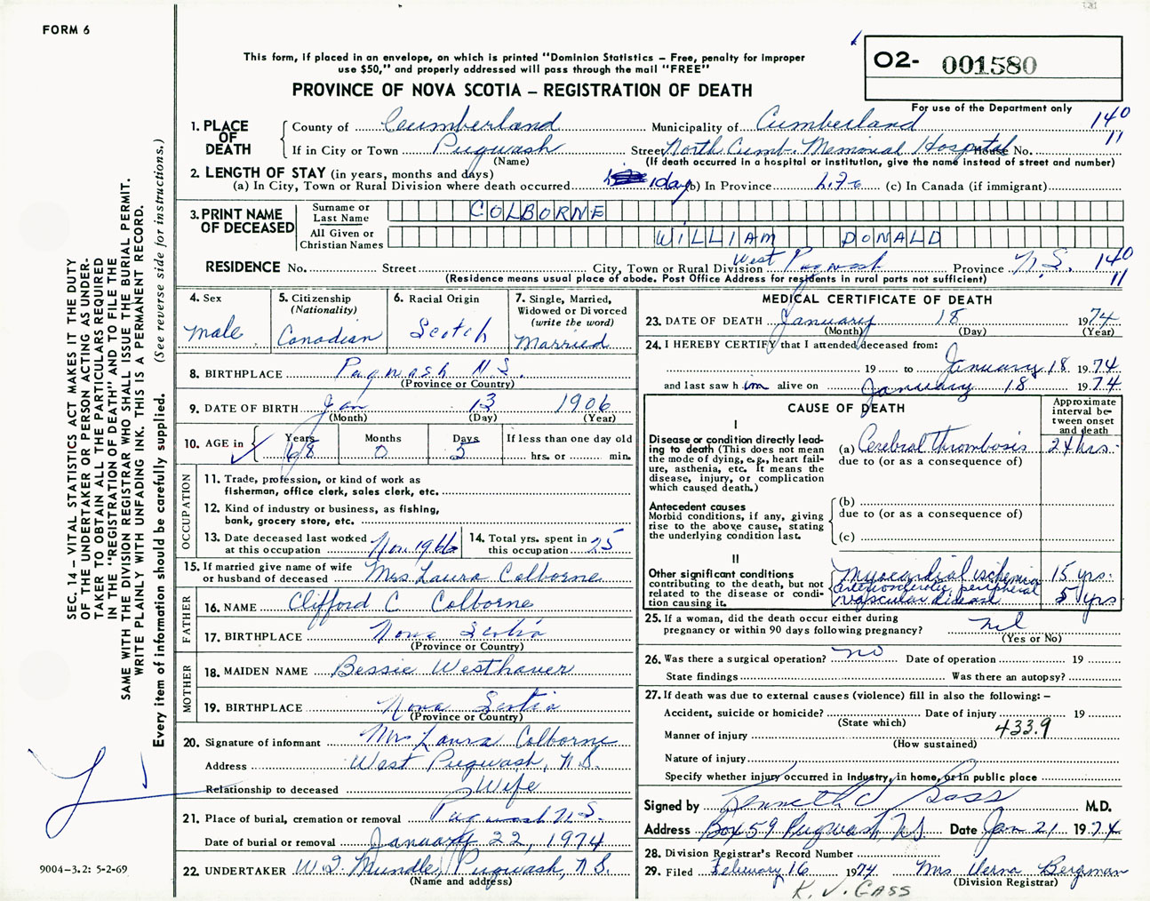 Male Death Registration: Year: 1974 number: 1580