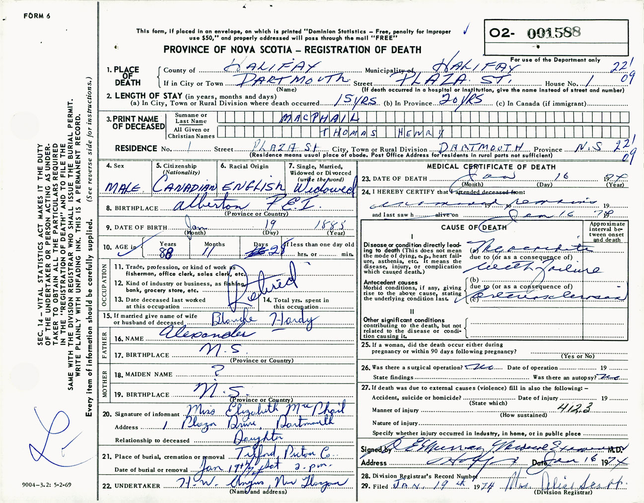 Male Death Registration: Year: 1974 number: 1588