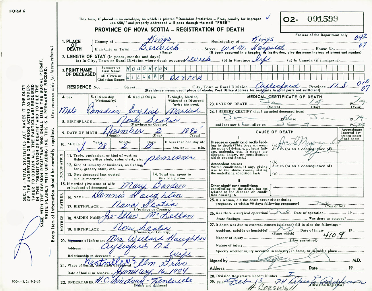 Male Death Registration: Year: 1974 number: 1599