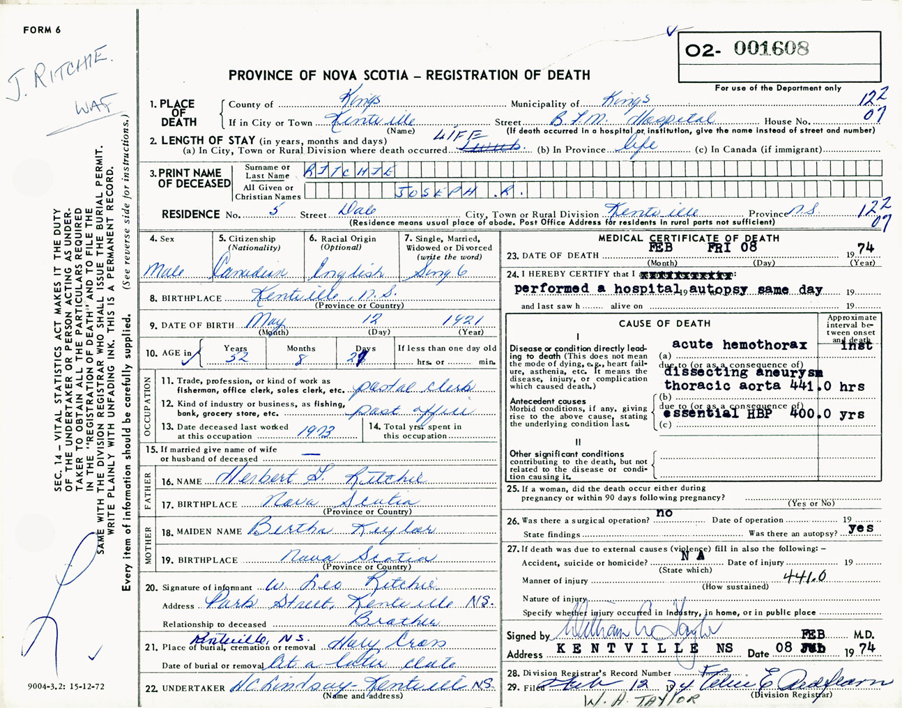 Male Death Registration: Year: 1974 number: 1608