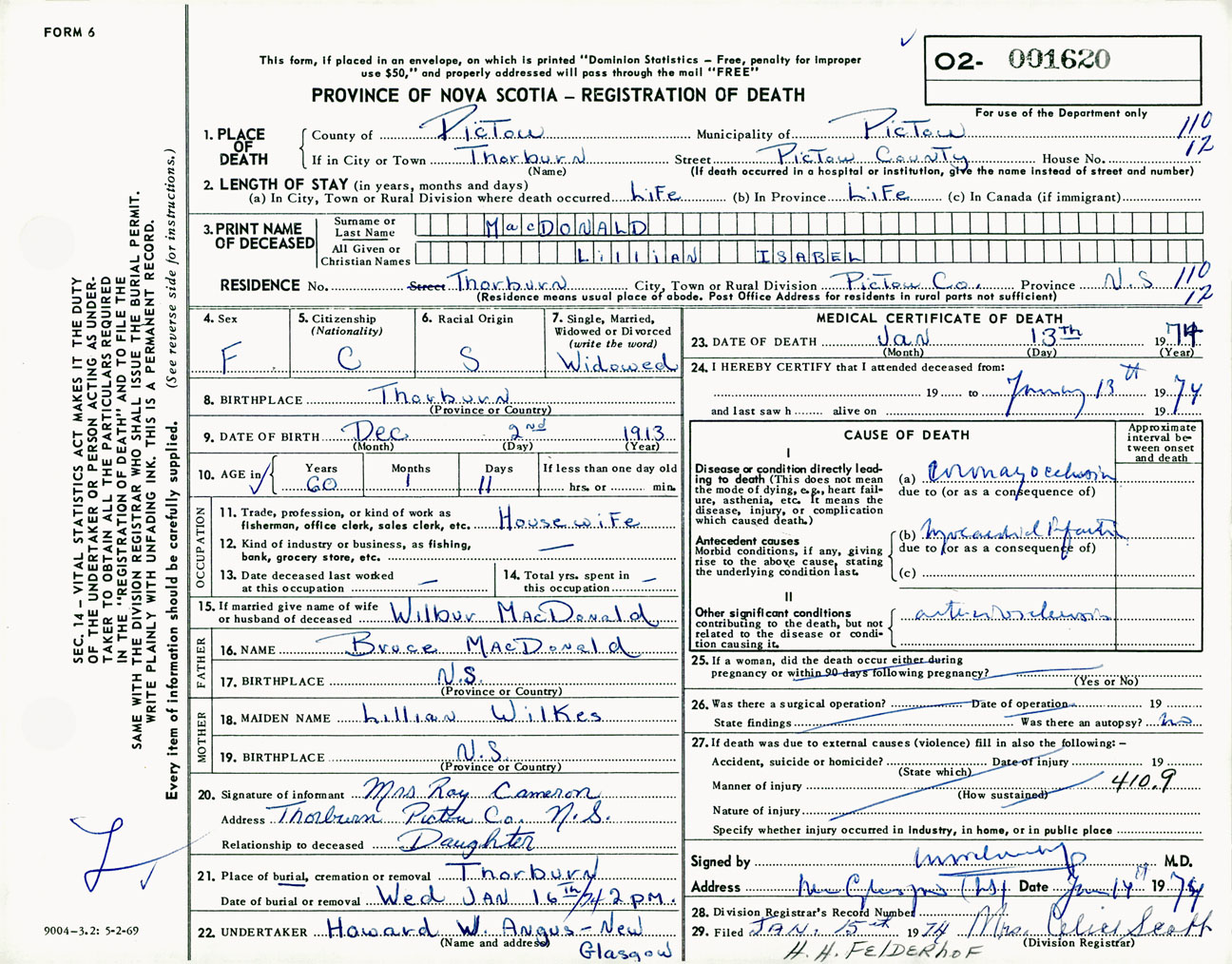 Female Death Registration: Year: 1974 number: 1620