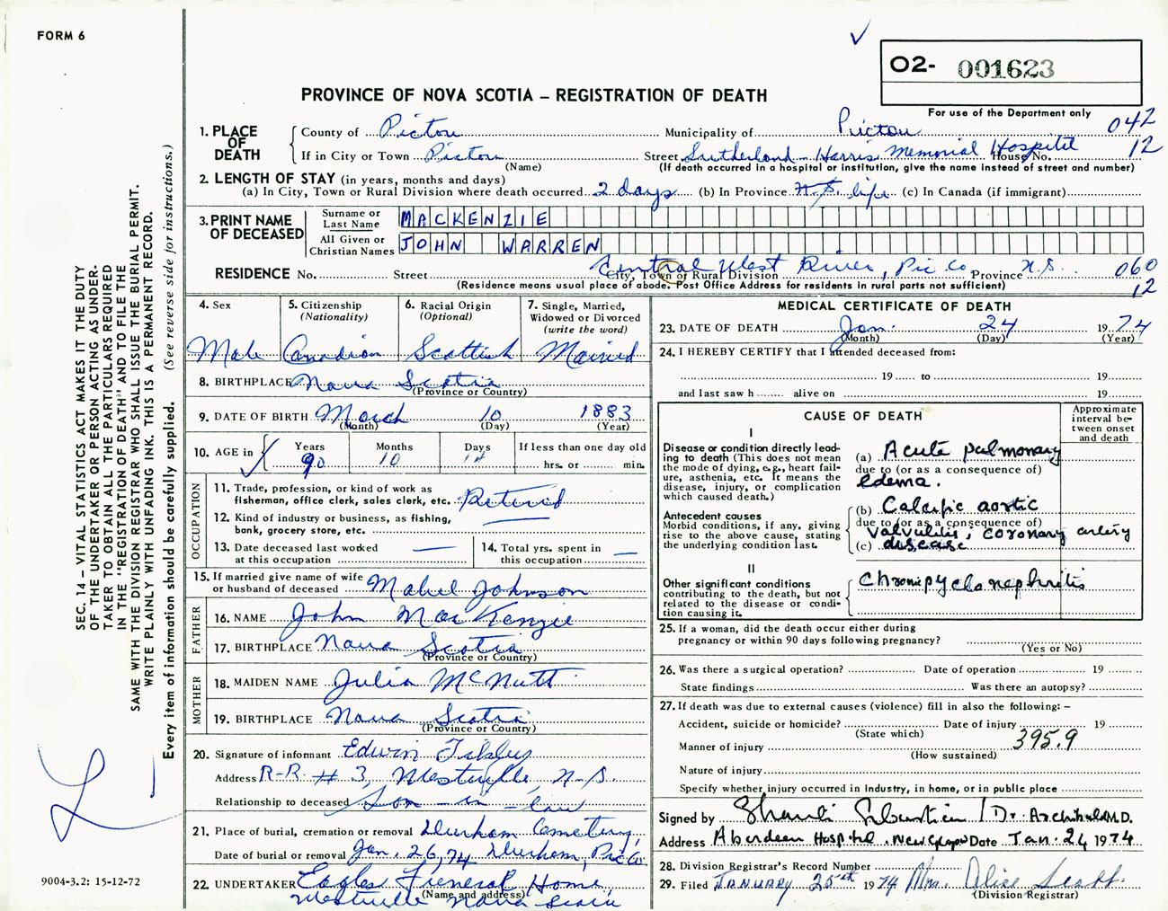 Male Death Registration: Year: 1974 number: 1623
