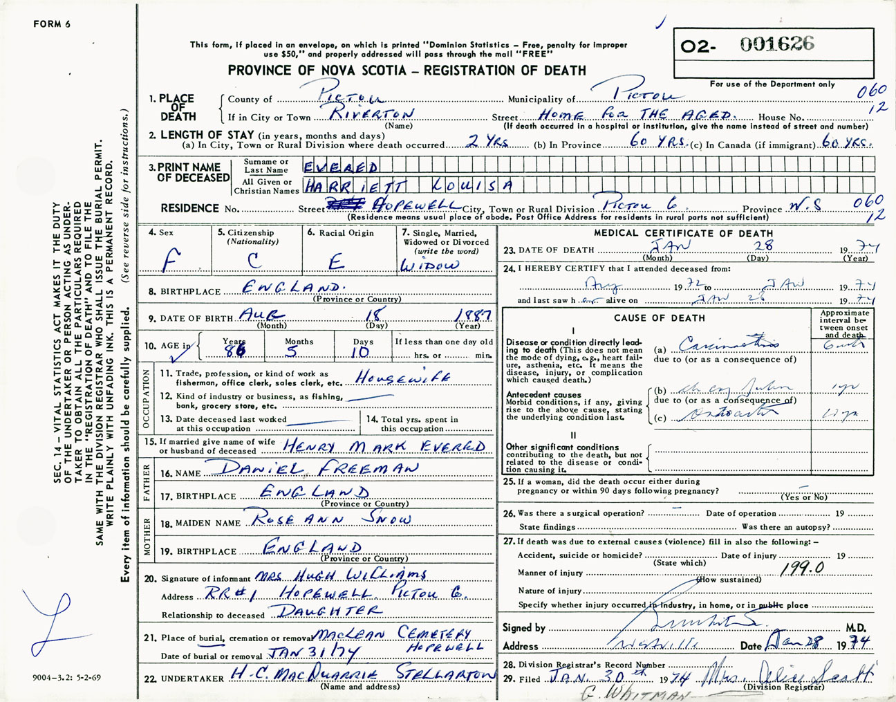 Female Death Registration: Year: 1974 number: 1626
