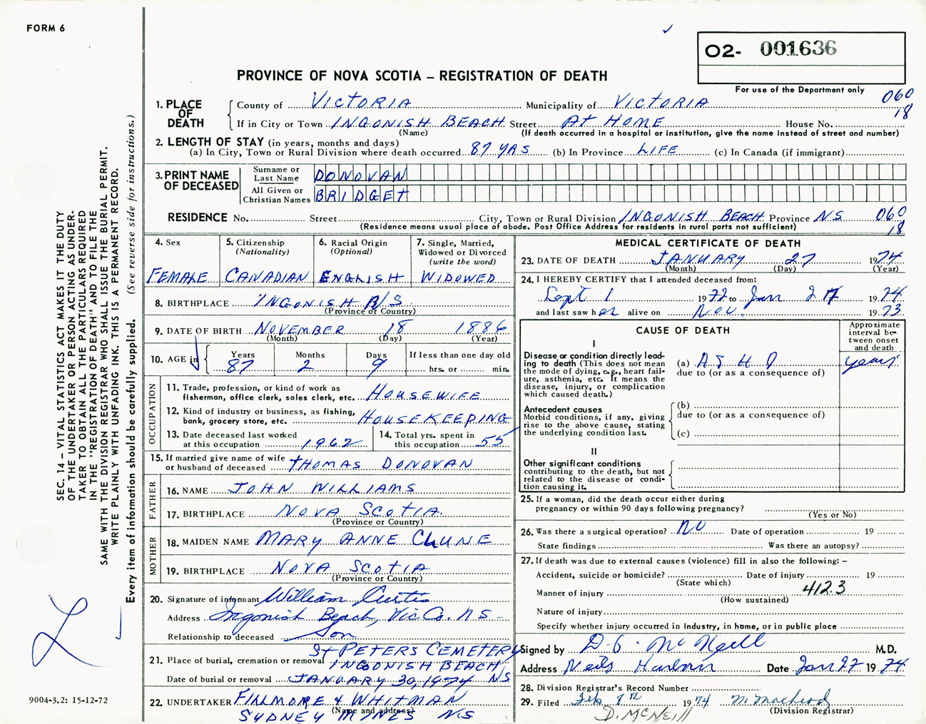 Female Death Registration: Year: 1974 number: 1636