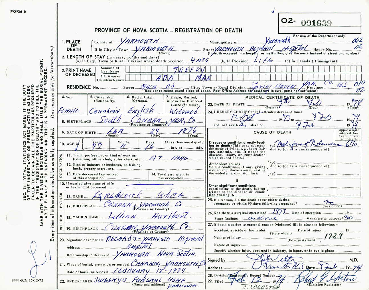 Female Death Registration: Year: 1974 number: 1639