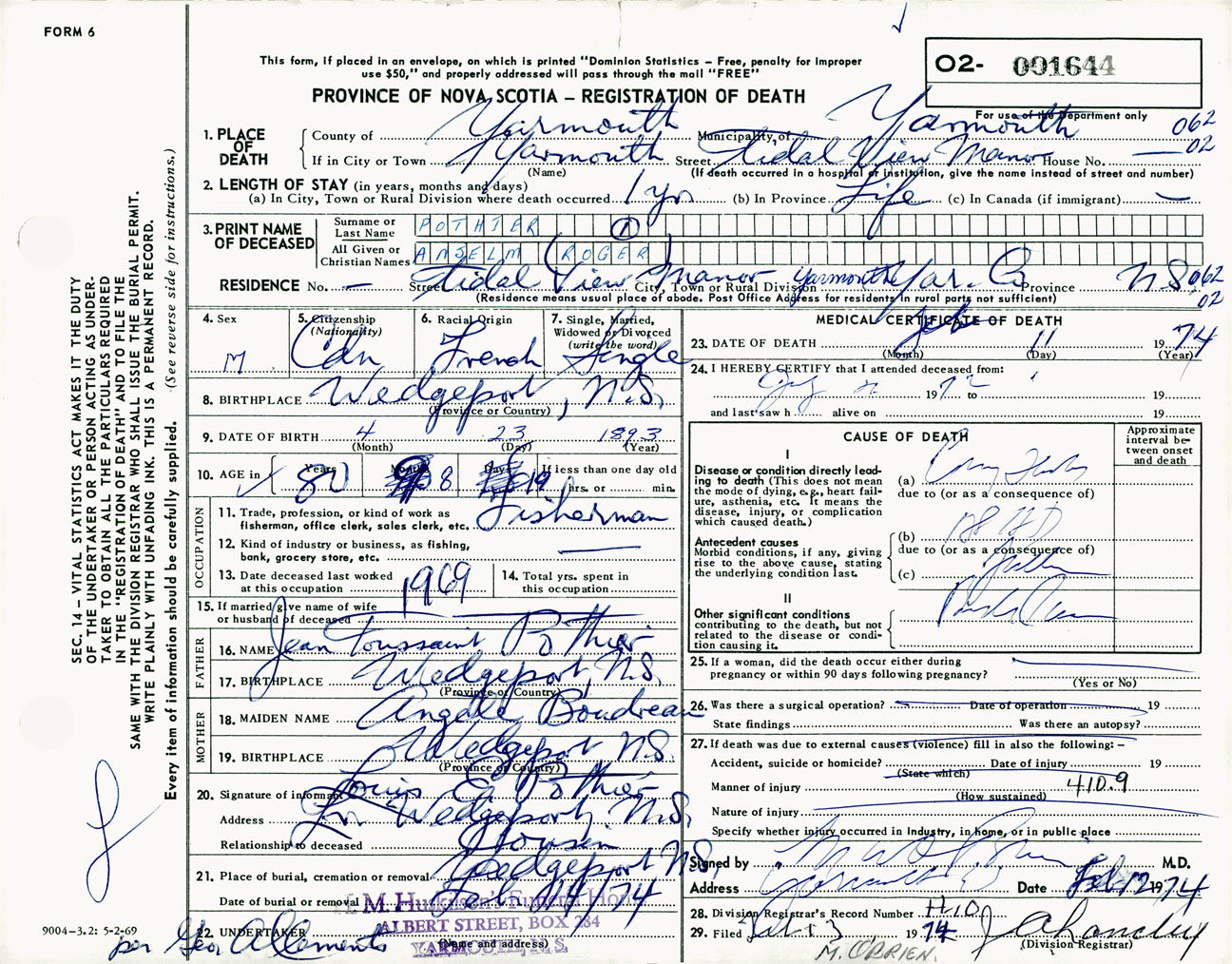 Male Death Registration: Year: 1974 number: 1644