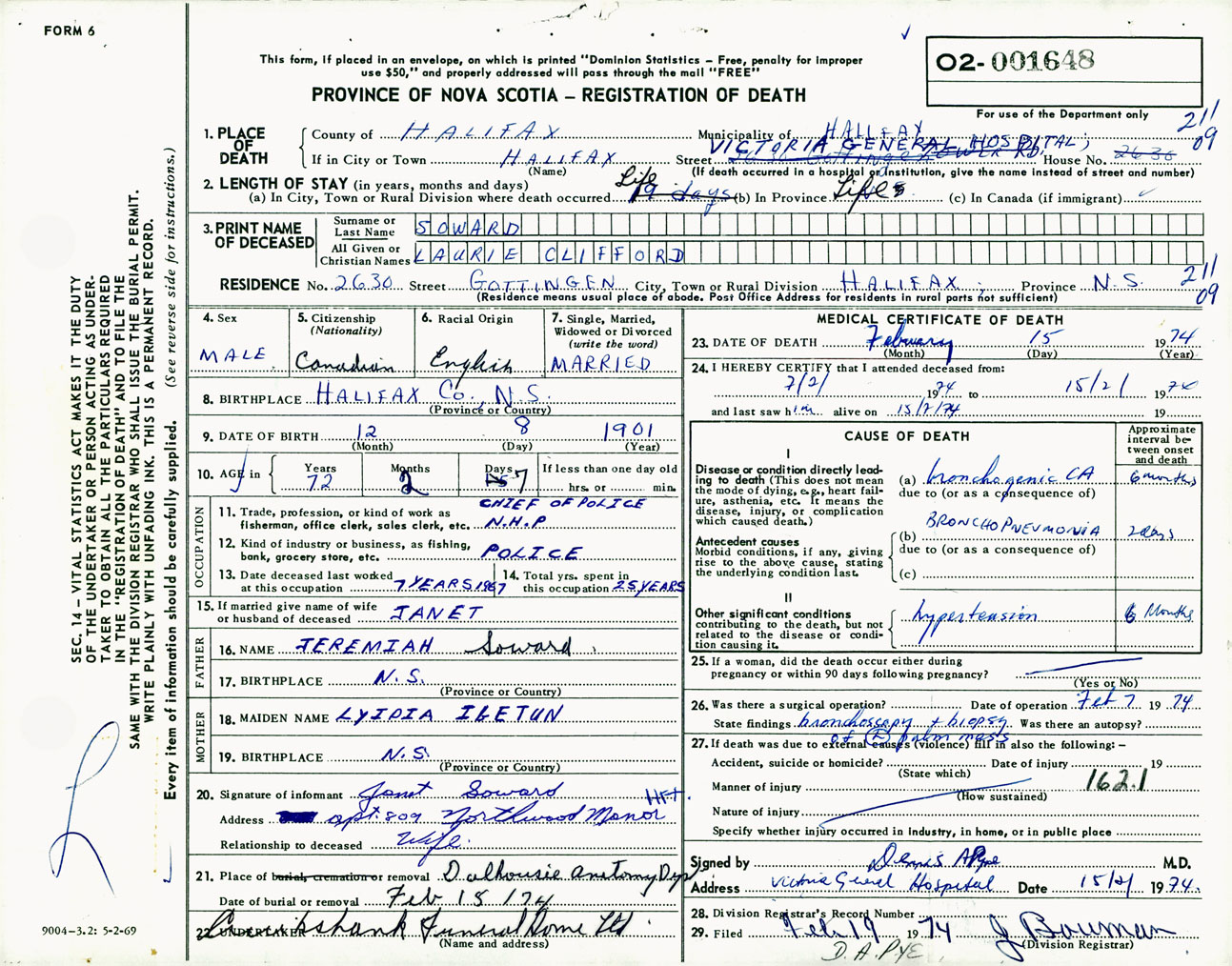 Male Death Registration: Year: 1974 number: 1648