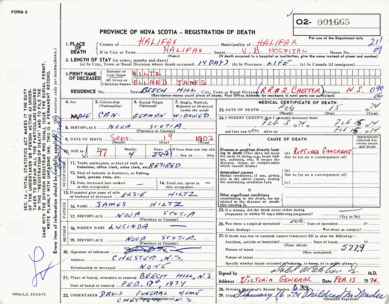 Male Death Registration: Year: 1974 number: 1665
