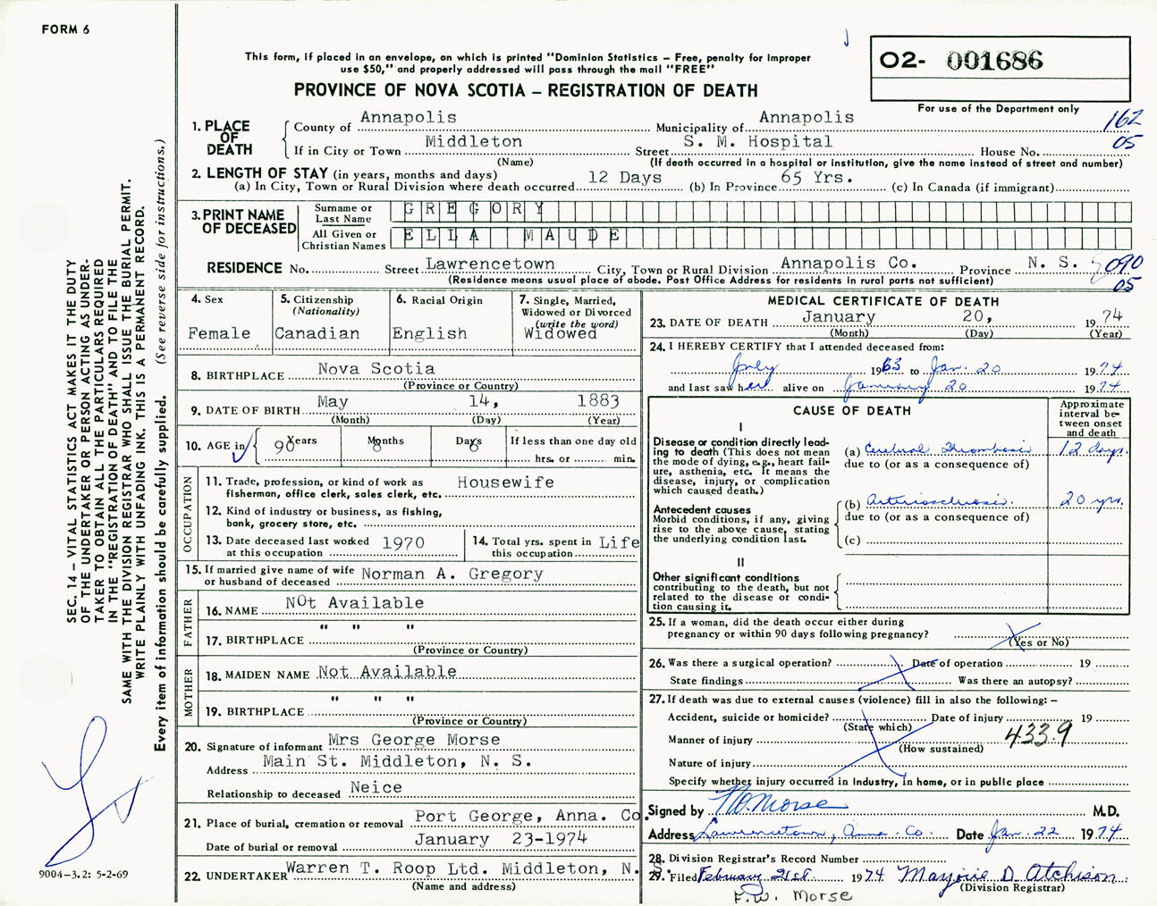 Female Death Registration: Year: 1974 number: 1686