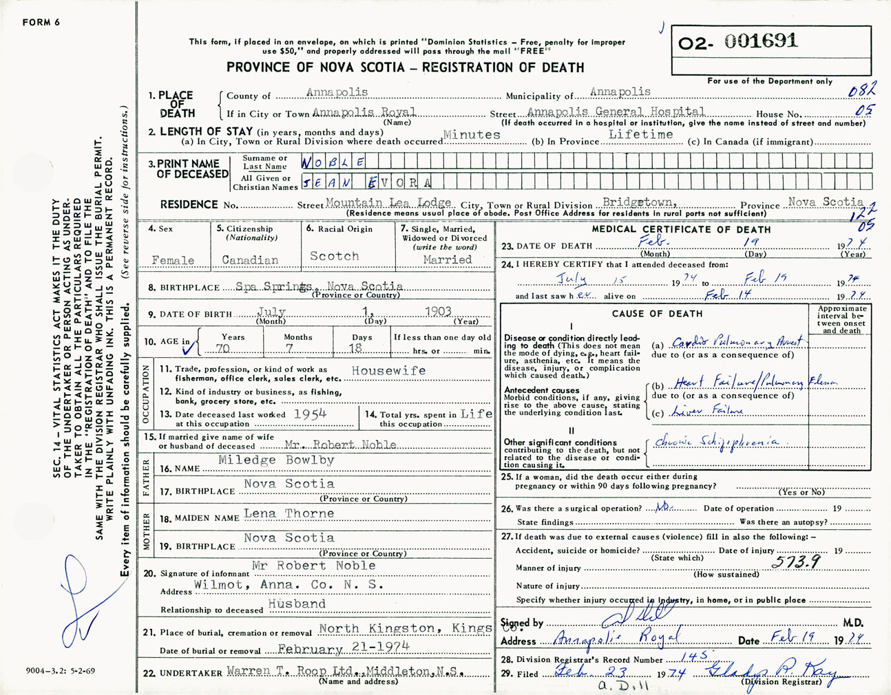 Female Death Registration: Year: 1974 number: 1691