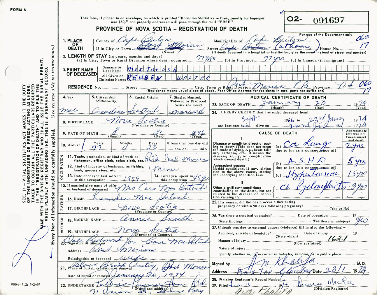 Male Death Registration: Year: 1974 number: 1697