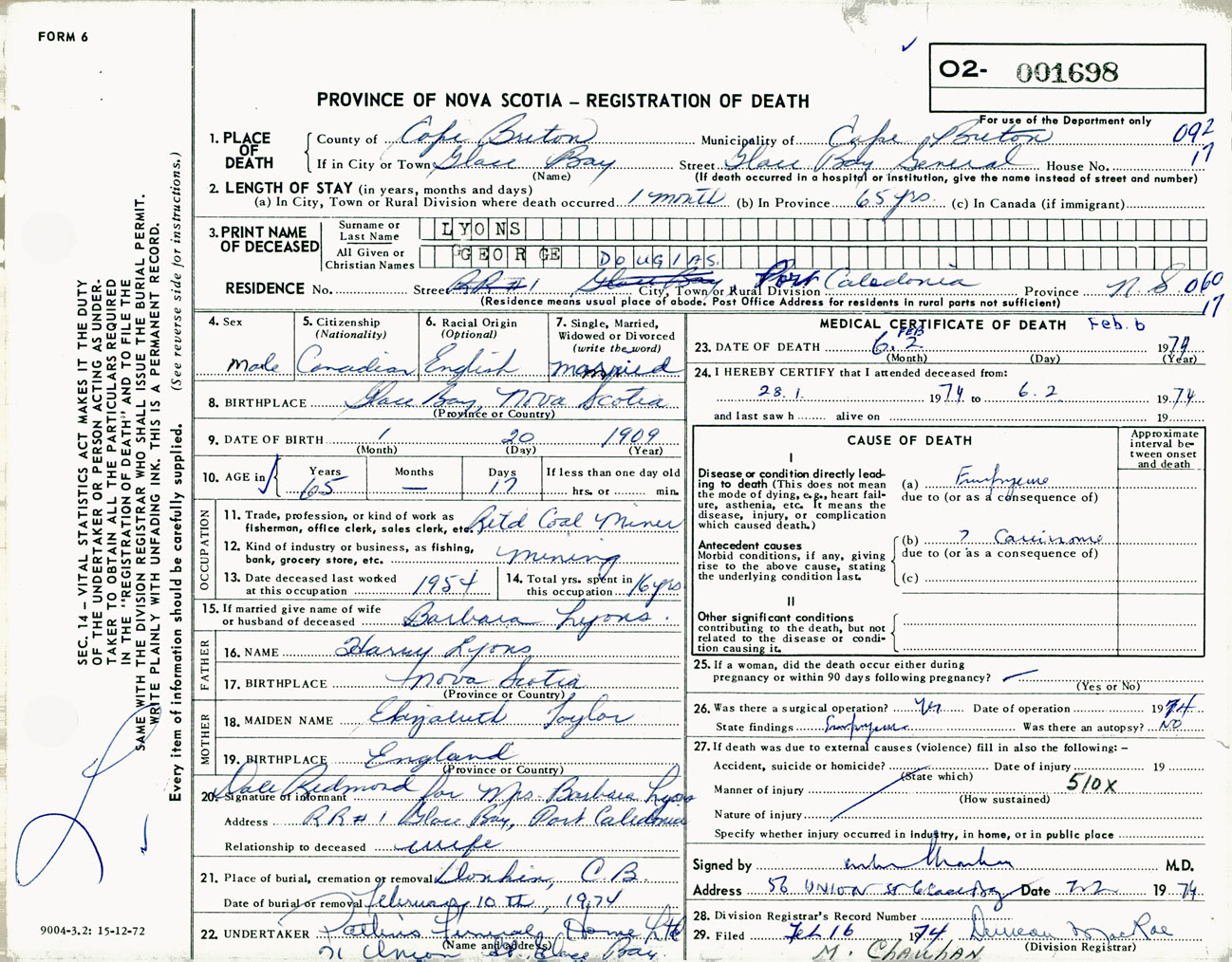 Male Death Registration: Year: 1974 number: 1698