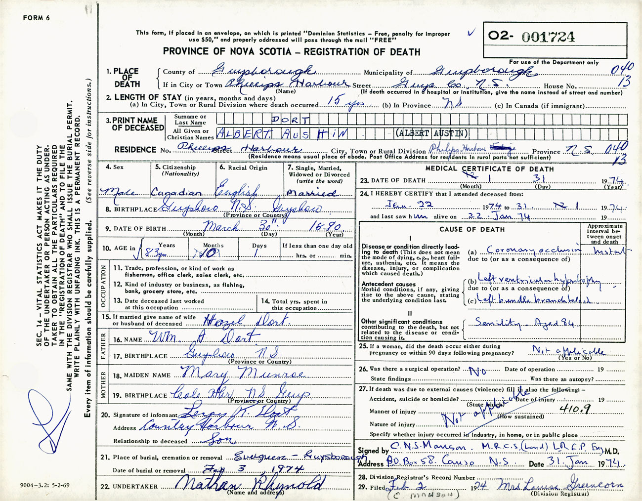 Male Death Registration: Year: 1974 number: 1724