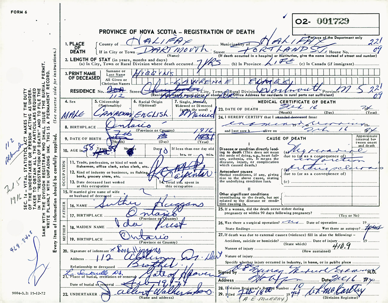 Male Death Registration: Year: 1974 number: 1729