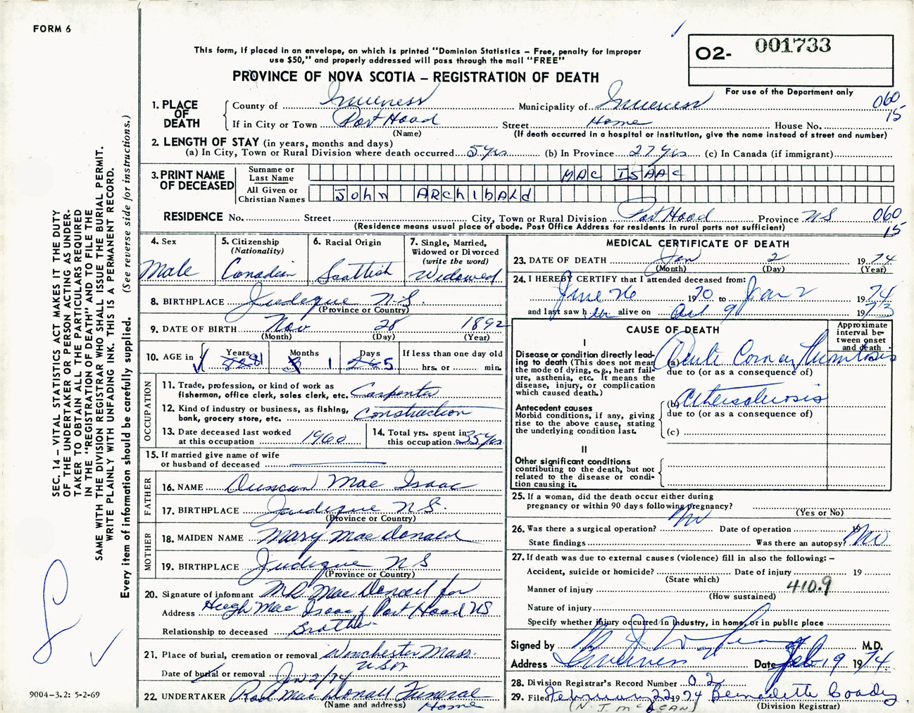 Male Death Registration: Year: 1974 number: 1733