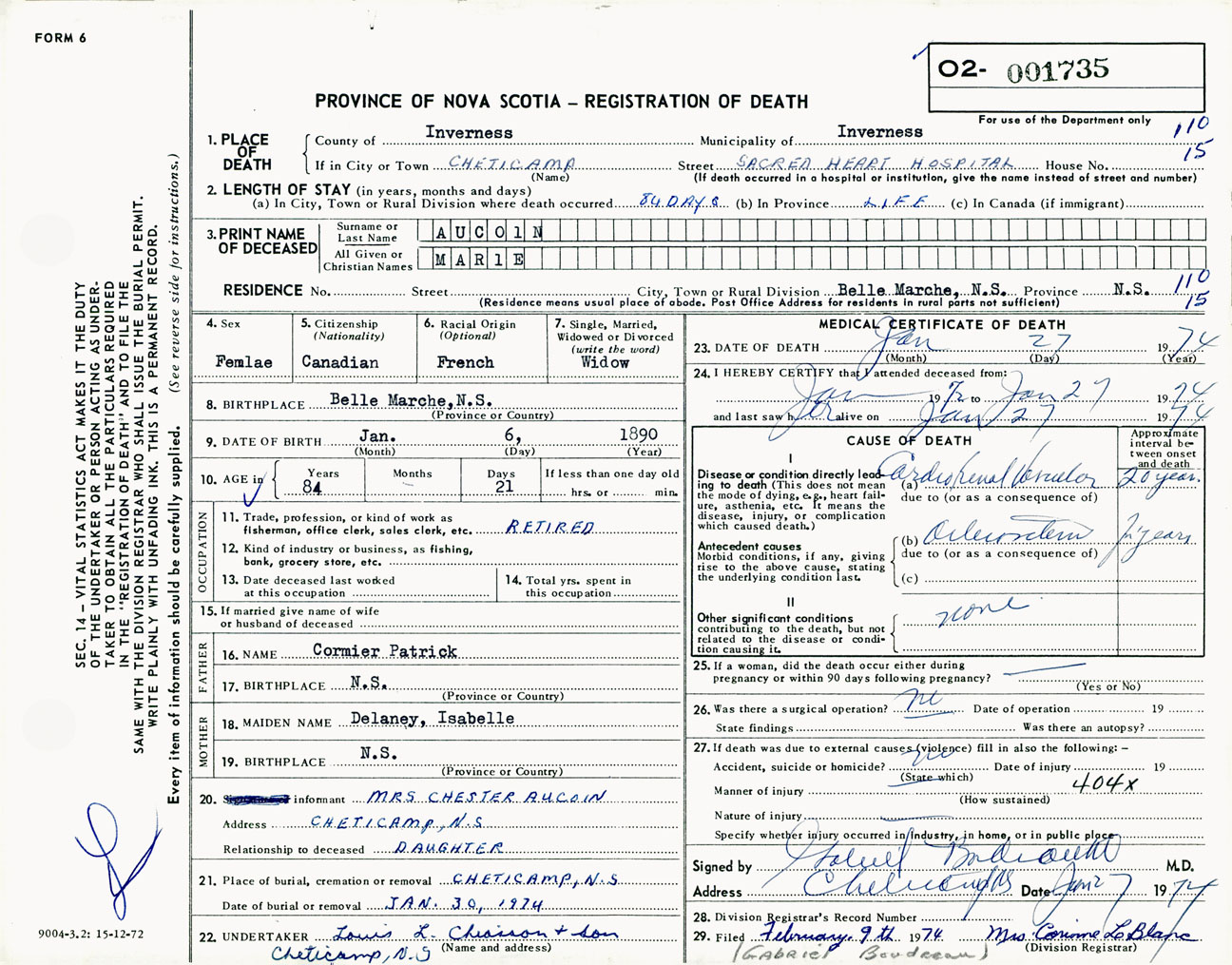 Female Death Registration: Year: 1974 number: 1735