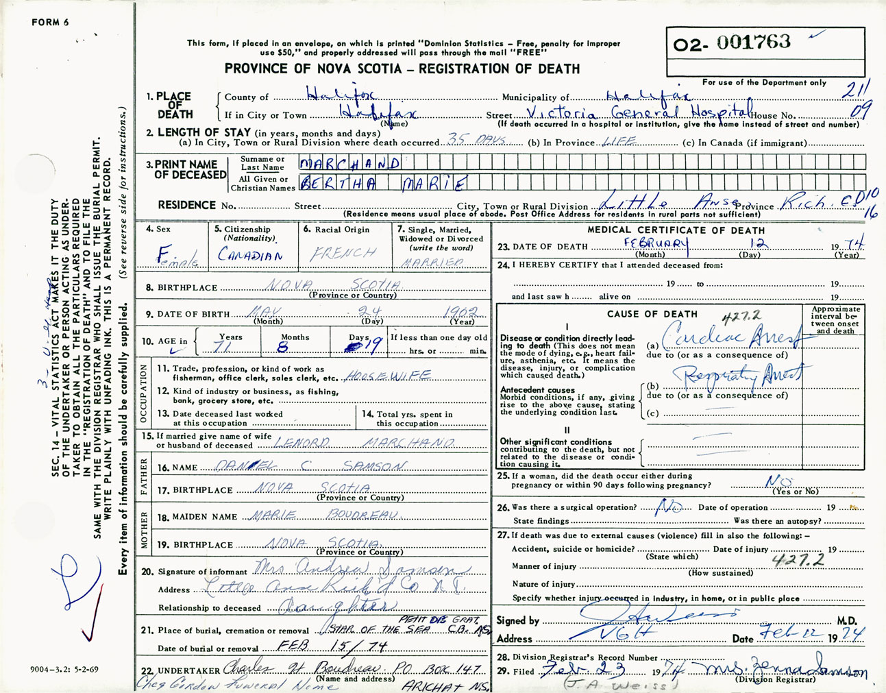Female Death Registration: Year: 1974 number: 1763