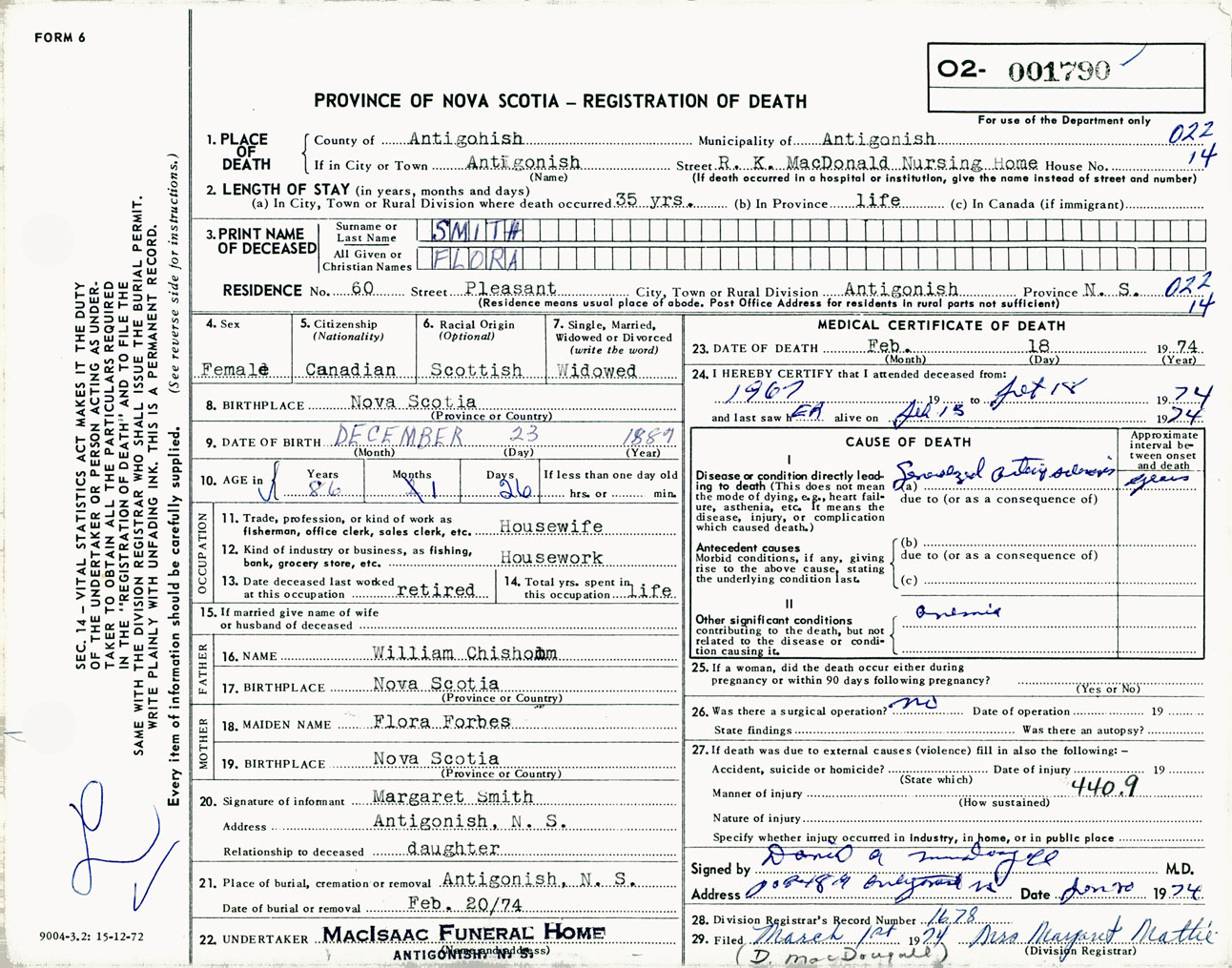 Female Death Registration: Year: 1974 number: 1790