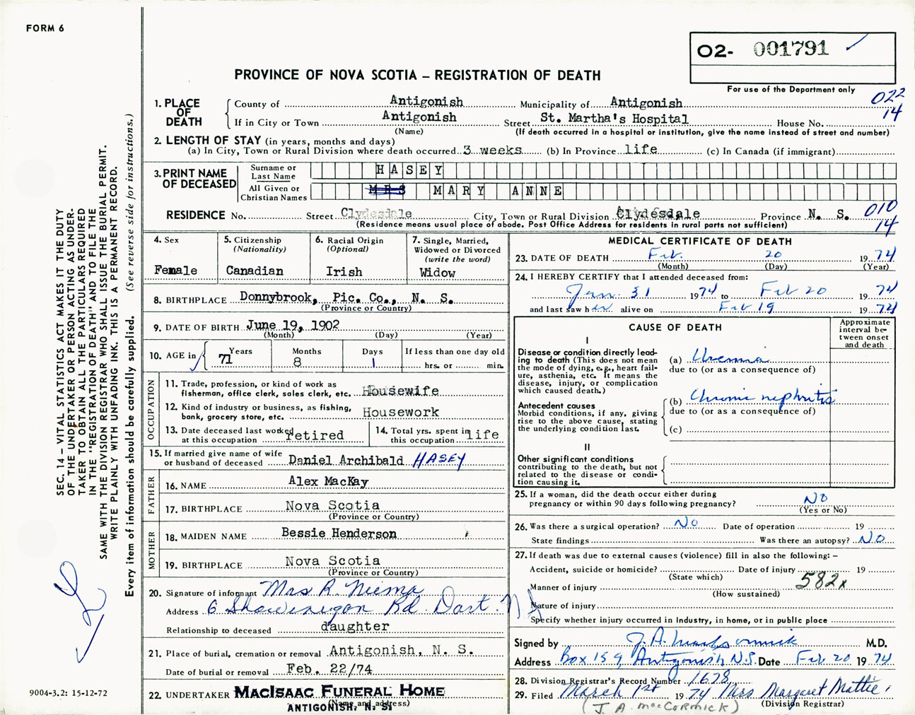 Female Death Registration: Year: 1974 number: 1791