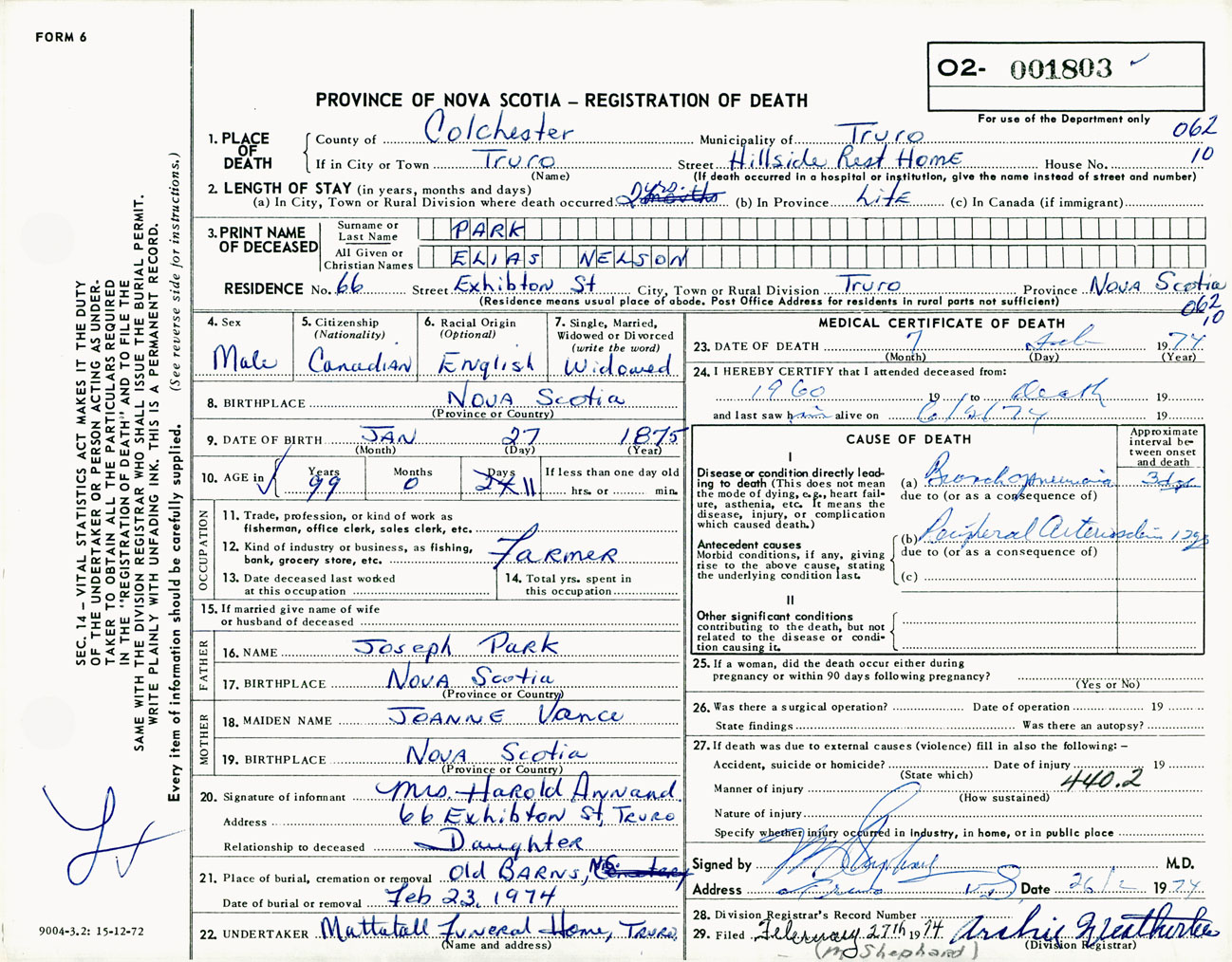 Male Death Registration: Year: 1974 number: 1803
