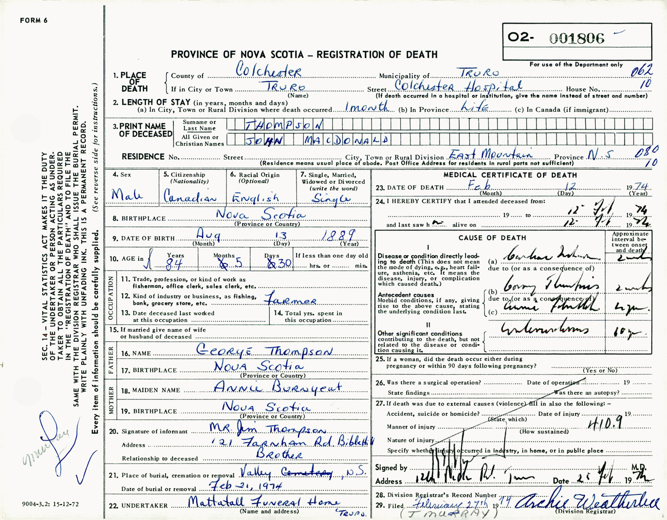 Male Death Registration: Year: 1974 number: 1806
