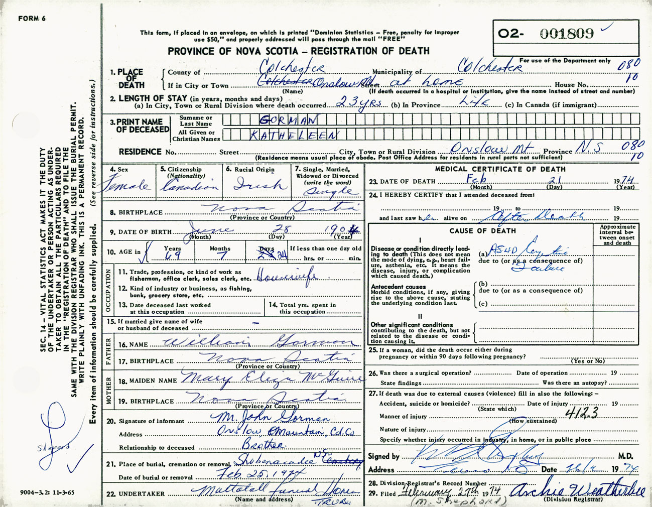Female Death Registration: Year: 1974 number: 1809