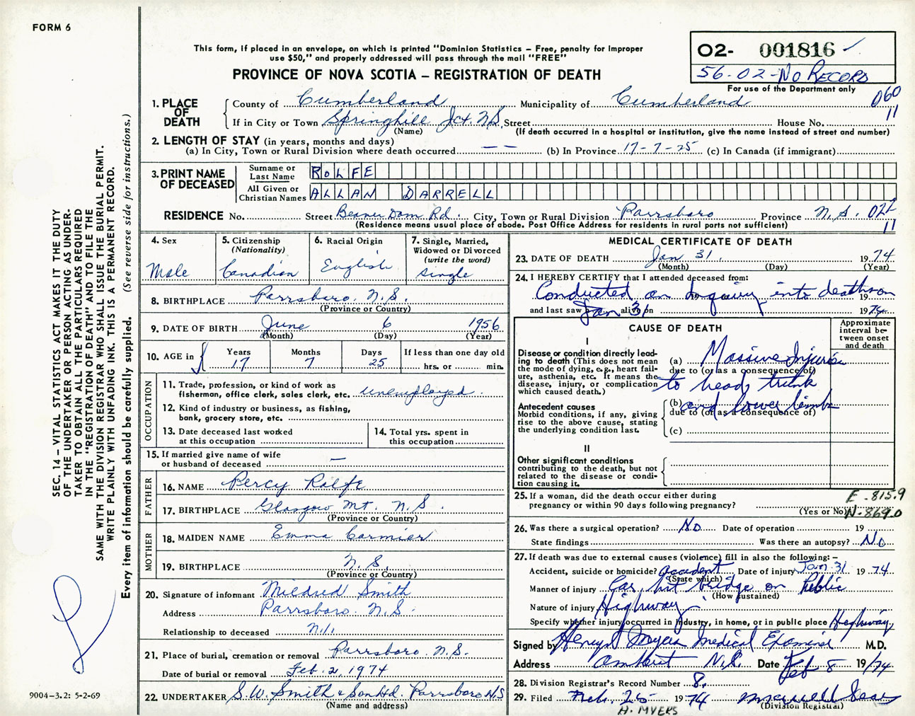 Male Death Registration: Year: 1974 number: 1816