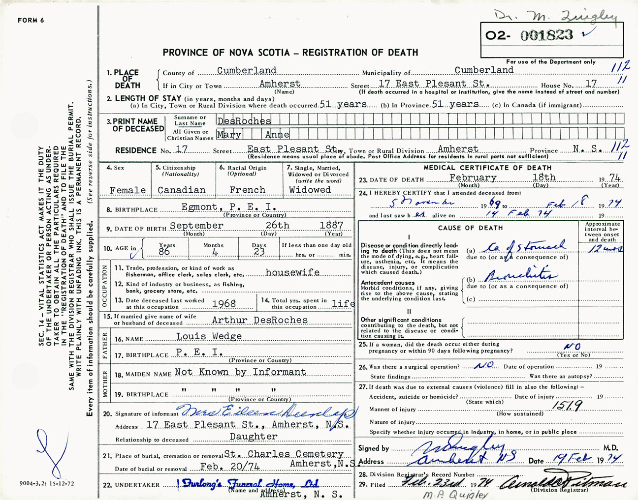Female Death Registration: Year: 1974 number: 1823