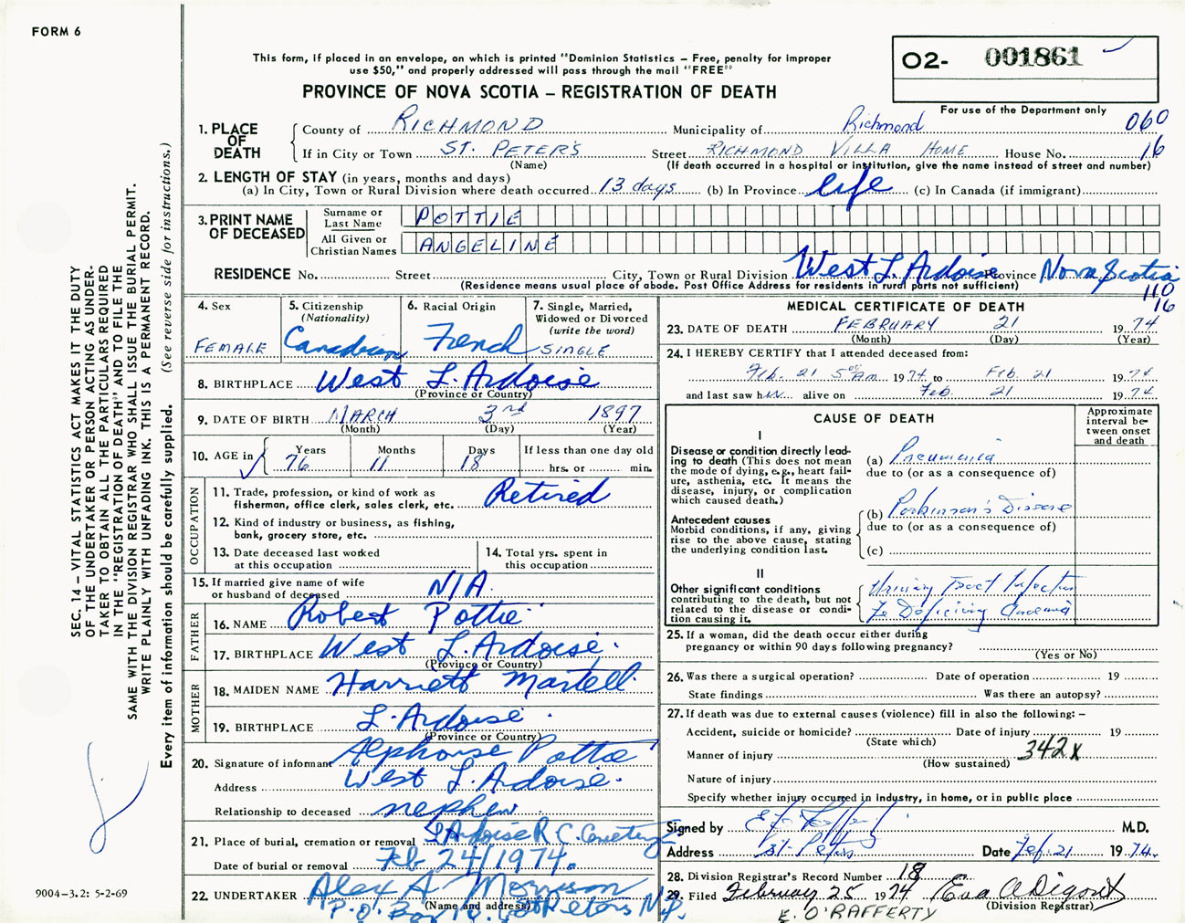Female Death Registration: Year: 1974 number: 1861