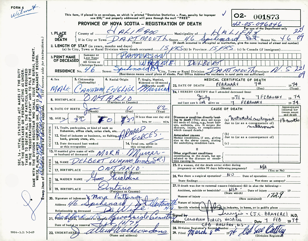 Male Death Registration: Year: 1974 number: 1873