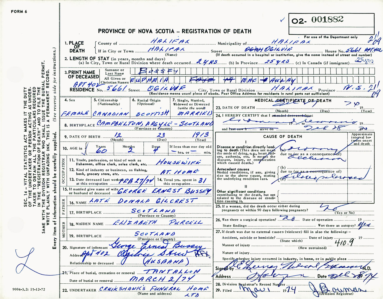 Female Death Registration: Year: 1974 number: 1882
